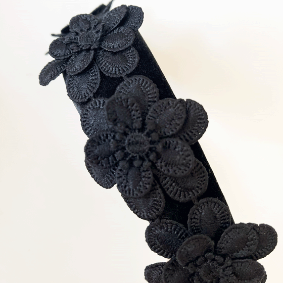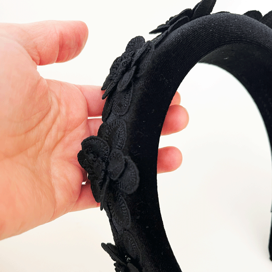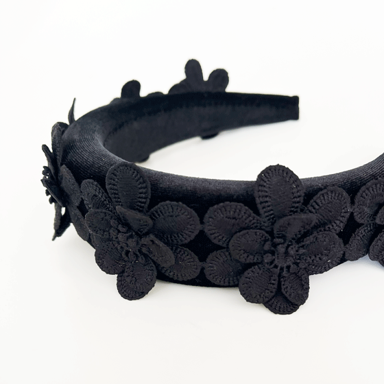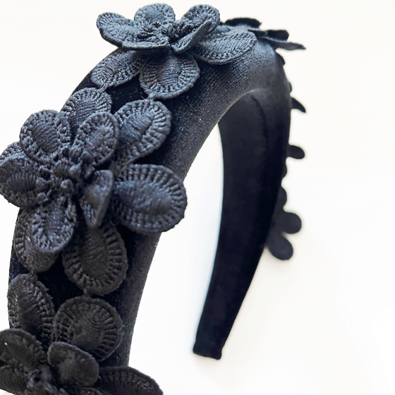BLACK SPANISH GUIPURE LACE ON BLACK PADDED HEADBAND